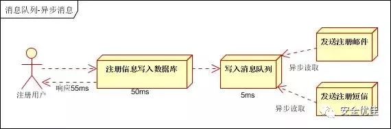 按照以上约定,用户的响应时间相当于是注册信息写入数据库的时间,也就是50毫秒。注册邮件,发送短信写入消息队列后,直接返回,因此写入消息队列的速度很快,基本可以忽略,因此用户的响应时间可能是50毫秒。因此架构改变后,系统的吞吐量提高到每秒20QPS。比串行提高了3倍,比并行提高了两倍!