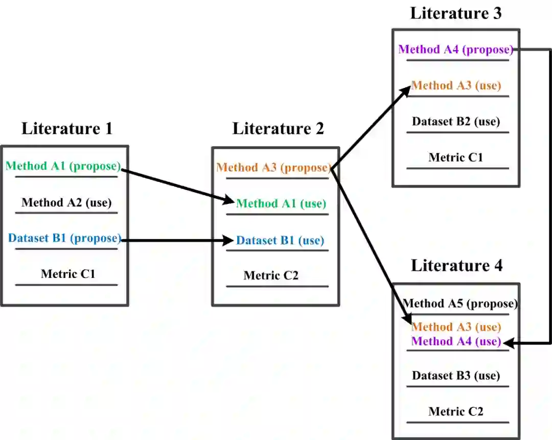我们的路径图构建同 [28] 中的方法存在两点区别:1)我们增加了数据集的关系,方法和方法之间通过数据集建立联系,从而提供了额外的信息;2)我们通过大规模文献来获取方法,可以同时得到大量的路径图。