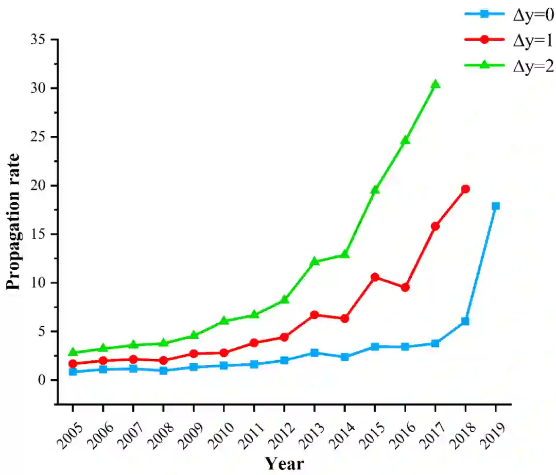 我们对 2005 年到 2019 年每年由 CCF corpus 中的文献提出的有效方法在数据集上的传播情况进行了分析。y 年提出的有效方法于 y 到 y+△y 时间区间内在数据集上的传播率计算公式如下: