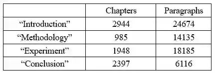 通常,一篇 AI 文献的正文包括引言、方法介绍、实验章节、结论四个部分。本文利用章节分类策略将 AI 文献的正文按上述四部分进行分类。