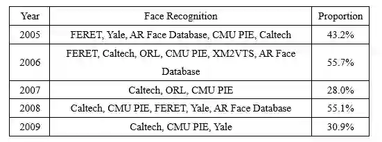 表 5 显示,2005-2019 年人脸识别的常用数据集有 Caltech、Yale、CMU PIE、CelebA。Caltech 在每年排名前十的有效数据集中均出现且占比都较高。Yale 出现的年份也很多,但是在 CelebA 数据集出现后,其地位就被 CelebA 替代。