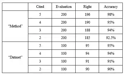 我们随机抽取得到的结果中被明确引用次数为 5、4、3、2 的方法各 200 个,被明确引用次数为 5、4、3、2 的数据集各 100 个。对这 800 个方法和 400 个数据集对应的原始文献结果进行人工评估,评估结果见表 4。结果准确率都超过了 90%。