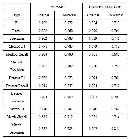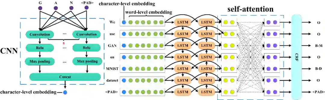 对于一个输入句子 {w_1,w_2,… ,w_n},其中 w_i 表示第 i 个单词。首先将每个单词切分成字符级,通过 CNN 网络获取到每个单词的 character-level embedding。然后经过 Glove embedding[17] 模块获取到每个单词的 word-level embedding。将句子中每个单词的 character-level embedding 与每个单词的 word-level embedding 拼接,然后送入到 Bi-LSTM。使用 self-attention[25] 计算每个单词与其他所有单词之间的关联。最后,将通过 self-attention 获取到的隐向量送入 CRF[10],得到每个单词的标签序列 y。y∈{B-M,I-M,B-D,I-D,B-C,I-C,O,padding},分别对应方法、数据集、指标和其他。