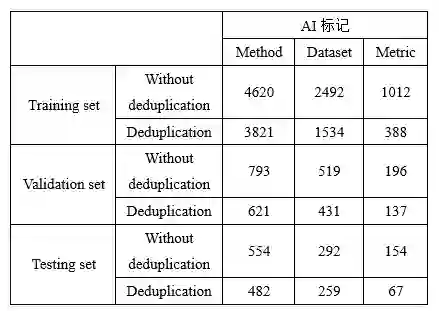 在构建 AI 标记抽取模型时,我们将 TMEdata 按照 7.5:1.5:1 的比例划分成训练集、验证集和测试集。训练集、验证集和测试集中包含的三种 AI 标记的数量如表 2 所示。