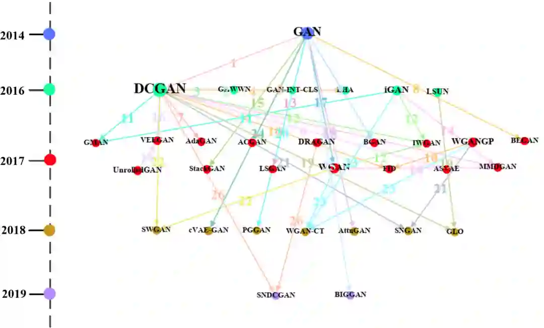 Figure 14:'GAN' 簇中方法的路径图,图中点的颜色表示年份,点的大小表示出度,线的颜色表示数字代表的数据集。