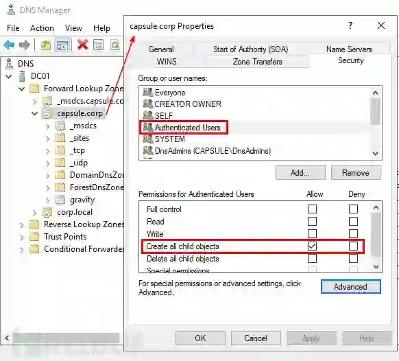3. 默认情况下,经过身份验证的用户在Active Directory集成DNS(ADIDNS)区域中,具有“创建所有子对象”ACL。这样可以创建新的DNS记录。