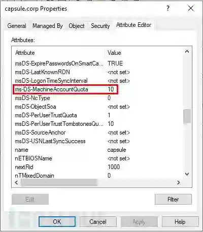 1. 默认的Active Directory ms-DS-MachineAccountQuota属性,允许所有域用户向域中添加最多10个计算机帐户[4]。另外,计算机帐户具有其SPN属性的值,因此允许使用S4U协议。