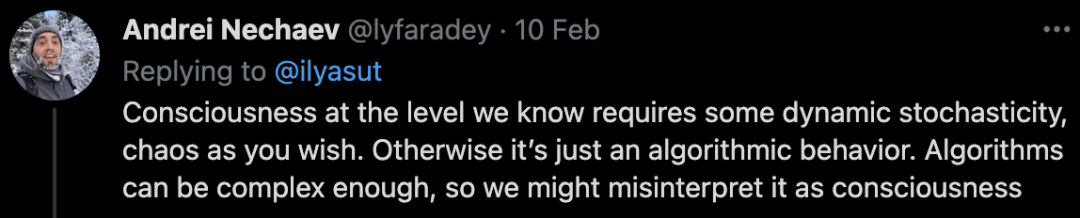 有网友在伊利亚的原推下回复:「现在人类所知的自我意识,必须有相当程度的动态随机性,甚至可以称为混沌性。若无,则只是算法性质的行为。算法的确可能足够复杂,让观察者误以为它具有意识。」
