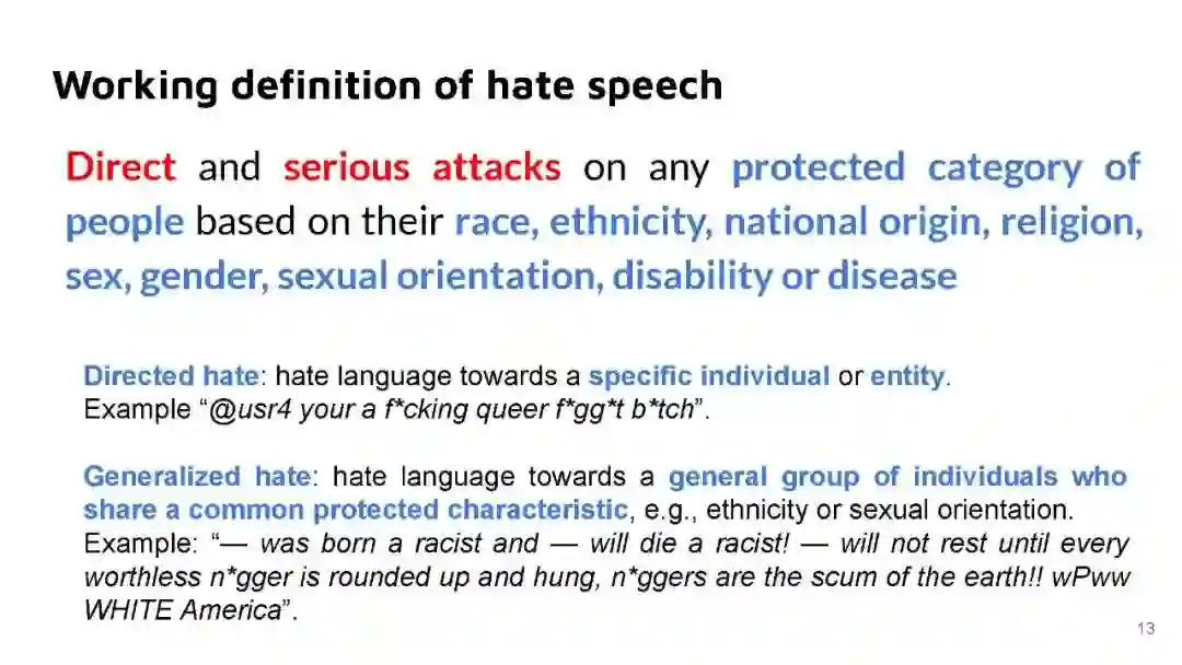 像Twitter和Facebook这样的社交媒体网站已经连接了数十亿人,并给了用户即时分享他们的想法和意见的机会。话虽如此,网络骚扰、网络喷子、网络欺凌、假新闻和仇恨言论也会带来一些不良后果。除此之外,仇恨言论是一种独特的挑战,因为它深深刻在我们的社会中,而且常常与线下暴力联系在一起。社交媒体平台依靠当地审查员来识别仇恨言论并采取必要行动,但随着社交媒体上此类内容的大量增加,许多人开始转向自动仇恨言论检测和缓解系统。这种转变给计算社会科学界带来了一些挑战,因此,这是一个重要的探索途径。