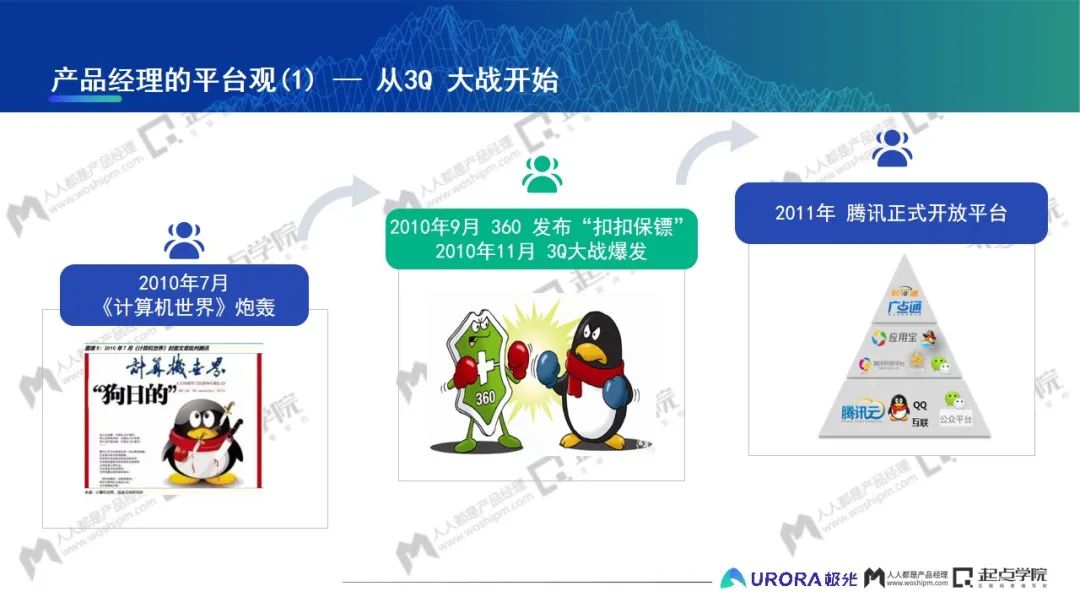 以前腾讯都是做应用、做桌面战略,所有的能够抢占用户时间的东西都要去做。3Q大战敲醒了腾讯这个睡狮,具备了非常强大的平台观,开始构建一个生态,以一个平台的视角去体验产品。