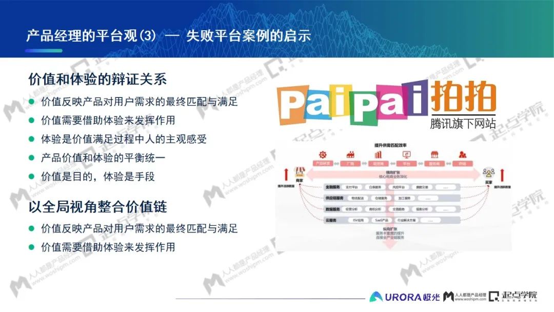 当时的拍拍光关注体验,没有去构建整个链条的价值,包括买家的价值、卖家的价值、供应链的价值,导致了这次失败,给我们的教训就是:当我们审视这个平台的时候,体验已经变成了一个手段,变得微不足道了。