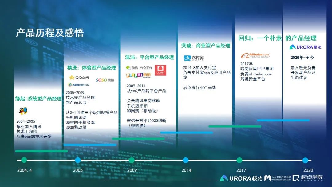其实我的职业经历非常简单:2004年研究生毕业之后加入腾讯,在腾讯工作了十年;后来加入蚂蚁金服,工作了3年;内部转岗到阿里巴巴,工作了两年;今年年初离开阿里,加入了极光。
