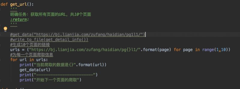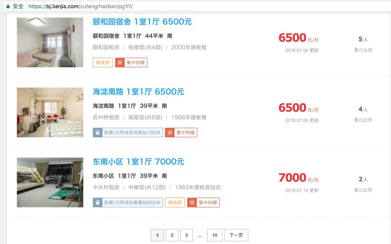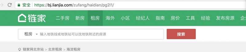 因此我们需要爬取10个网页的信息,也就是爬取多个页面。通过观察,我们发现第二个网址是https://bj.lianjia.com/zufang/haidian/pg2l1/,第三个是https://bj.lianjia.com/zufang/haidian/pg3l1/,因此得出网址的规律是pg2l1的页面以此加1。