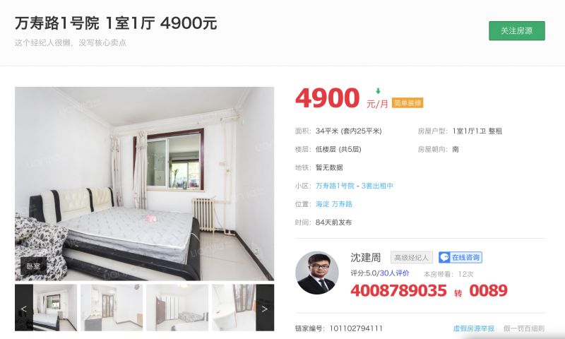 本次爬取目标是北京海淀区一居室的租房信息,如下图所示。这些信息主要包括标题,租金,小区名字,中介的头像以及姓名。