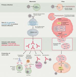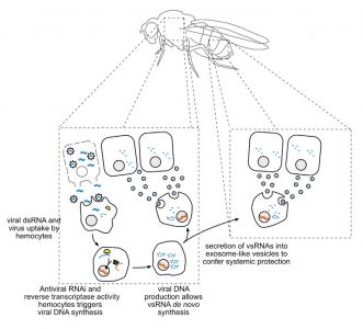 该研究显示果蝇具有由巨噬细胞样血细胞介导的复杂的基于全身RNAi的免疫。血细胞从感染的细胞中摄取dsRNA,通过内源转座子逆转录酶产生病毒衍生的互补DNA(vDNA)。这些vDNA模板从头合成二级病毒siRNA(vsRNA),分泌到外泌体样囊泡中。有趣的是,从感染果蝇的血淋巴中纯化的含有vsRNA的外泌体,在幼稚动物中赋予了针对病毒攻击的被动保护。因此,类似于脊椎动物,昆虫使用免疫细胞产生免疫记忆,其形式是稳定的vDNA,产生由含有vsRNA的外泌体介导的全身免疫。
