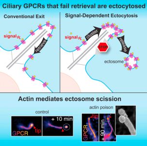 该研究发现当激活的G蛋白偶联受体(GPCR)未能通过BBSome介导由纤毛回到细胞时,这些GPCR在通过ectosome释放到细胞外前,会集中到纤毛膜芽的尖端。肌动蛋白actin和肌动蛋白调节剂drebrin和肌球蛋白myosin 6介导其从纤毛尖端的ectosome释放。从纤毛中释放激活的信号分子,这种信号依赖的回收作用(retrieval)、胞吐作用是有选择性和有效的过程。