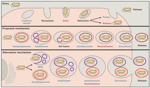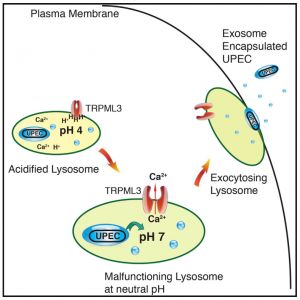 该研究表明,当尿路致病性大肠杆菌(UPEC)感染膀胱上皮细胞(BECs)时,它们被自噬靶向,但由于其中和溶酶体pH的能力而避免降解。粘蛋白TRP通道3(TRPML3)是一种定位于溶酶体的瞬时受体电位阳离子通道,可检测到这种变化。TRPML3激活自发启动溶酶体胞吐作用,导致外泌体包裹的细菌的排出。这些研究揭示了溶酶体稳态的细胞缺陷系统,这已被自主防御程序所采用以清除顽拗性病原体。