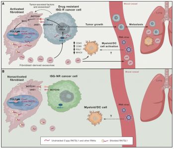 该研究发现,基质细胞和乳腺癌细胞利用旁分泌(paracrine)和近分泌(juxtacrine)信号来启动化疗和放疗的耐受性。在这种复杂的相互作用中,外泌体从基质细胞转移到乳腺癌细胞。外泌体中的RNA成分,大部分是非编码转录本和可转移元件,促进RIG-I受体的识别,从而激活STAT1依赖的抗病毒信号通路。与此同时,基质细胞也能激活乳腺癌细胞的NOTCH3。这种旁分泌的抗病毒作用和近分泌NOTCH3信号通路在STAT1汇合从而促进NOTCH3的转录反应和治疗耐受的肿瘤起始细胞的繁殖。原代人/鼠乳腺癌细胞分析支持抗病毒/NOTCH3信号在NOTCH信号通路和基质介导的耐受中的作用,这种作用能被γ分泌酶抑制剂废除。因此,基质细胞利用外泌体来介导抗病毒信号参与了一个错综复杂的与乳腺癌细胞的相互作用。这能够使乳腺癌耐受治疗并重新起始肿瘤的生长。