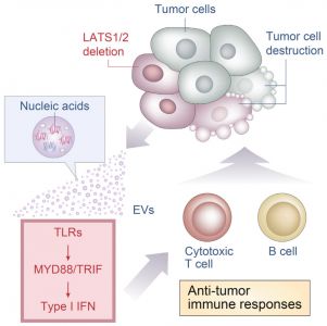 该研究发现Hippo通路在抑制抗肿瘤免疫中有意想不到的作用。研究证明,在三种不同的小鼠同源肿瘤模型(B16、SCC7和4T1)中,肿瘤细胞Hippo通路激酶LATS1/2(large tumor suppressor 1和2)的丢失抑制肿瘤生长。LATS1/2缺失的肿瘤抑制与适应性免疫反应相关,并且LATS1/2缺陷增强肿瘤疫苗的功效。机制上,无LATS1/2的肿瘤细胞分泌富含核酸的胞外囊泡,通过Toll样受体-MYD88/TRIF途径诱导I型干扰素反应。因此,肿瘤中LATS1/2的缺失增强肿瘤免疫原性,通过促进抗肿瘤免疫反应从而最终导致肿瘤被破坏。该研究发现了Hippo通路在调节肿瘤免疫原性中的关键作用,并证明了在癌症免疫治疗中靶向LATS1/2的概念。