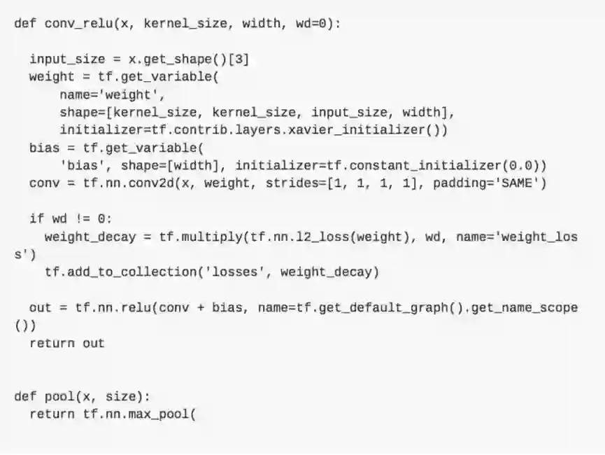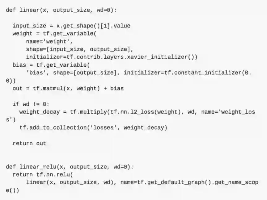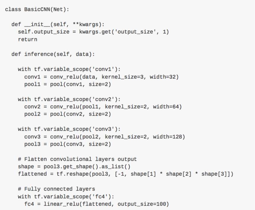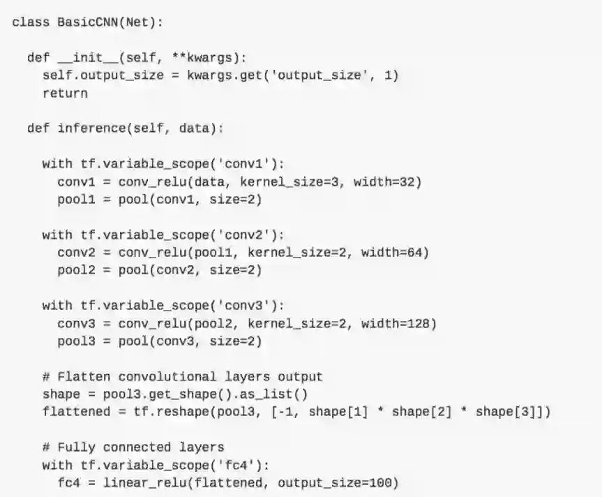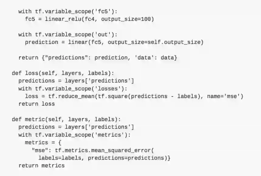 inference我们在 inference 函数中定义网络的主体结构。因为模型会重复用到全连接层和卷积层,因此我们将他们封装成函数linear_relu和conv_relu,从而方便复用代码。 网络结构上我们采用了比较简单的 3 层卷积,2 层全连接的结构。卷积层的输出通过tf.reshape转化成了全连接层可以接受的格式。因为是回归问题,我们直接将最后一层全连接层的结果作为输出。