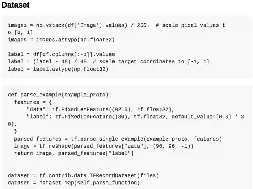 人脸关键点检测是现在视觉领域比较成熟的一项应用,是活体检测,人类美化,人脸识别等高级应用的基础。本文最后通过一个人脸关键点检测的例子,展示如何用 Tensorflow 实现图像回归类的应用。实验数据集采用 Kaggle 比赛中的 Faical Kerypoints Detection 数据集(https://www.kaggle.com/c/facial-keypoints-detection)。该数据集包含了 7094 张训练图片和 1783 张测试图片。数据集中的每一张人脸都有 15 个关键点的标注,图片的尺寸为 96x96。