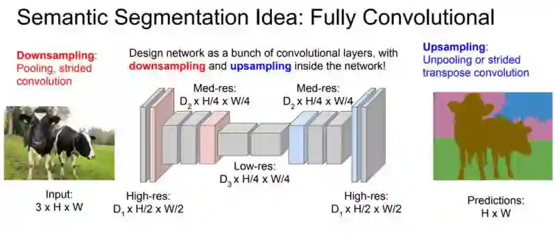 分割问题是指给出图片中每个像素点的类别。 基于 FCN 的分割方法和上面介绍的 one-stage 的检测方法非常类似。 对一个多分类的分割问题,对输出的每一个位置,我们可以判断其所属的类别。 在 FCN 的框架下,对于 N 分类问题,输出为 H/S × W/S × N。之后通过反向传播的方式进行训练。 分割和检测问题有一个区别是我们有时需要得到和输入图片同样大小的输出(H × W × N),但卷积神经网络为了加速,通常会添加 pooling 层,减小中间卷积层的尺寸。 如下图所示,为了保证输出的尺寸满足要求,我们可以在网络的最后添加反卷积层进行补偿,从而获得更大尺寸的输出。