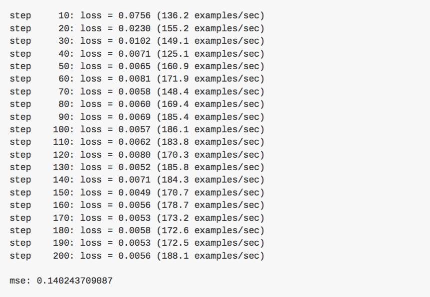 测试时,我们依旧使用 tensorflow 提供了 tf.metrics 模块,自动完成对每个 batch 的评价,并将所有的评价汇总。在这个例子里,我们是解决回归问题,因此可以使用tf.metrics.mean_squared_error计算均方误差。