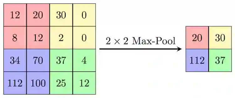 我们以 max pooling 举例,max pooling 对 kernel size 范围内的所有值取 max,结果作为对应位置的输出。pooling 通常是对每个 channel 单独操作,因此输出的 channel 数和输入相同。池化层和卷积层类似,pooling 操作也可以理解为采用滑动窗口的方式,因此也有和卷积对应的步长 stride 和 padding 等概念。 下图所示就是一个 kernel size 和 stride 都为 2 的 max pooling 操作:
