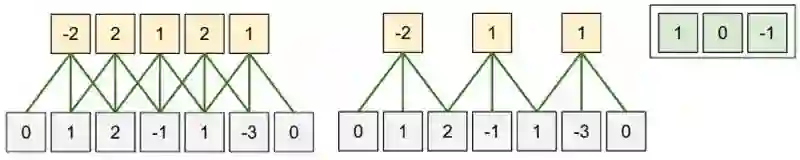 如下图所示,对 1D 的情况,假设输入尺寸为 W ,filter 的尺寸为 F,stride 为 S,padding 为 P ,那么输出的尺寸为 (W - F + 2P)/S + 1为。 通过设定 P=(F-1)/2,当 S=1 时,输入和输出的尺寸会保持一致。2D 卷积的计算和 1D 卷积类似。