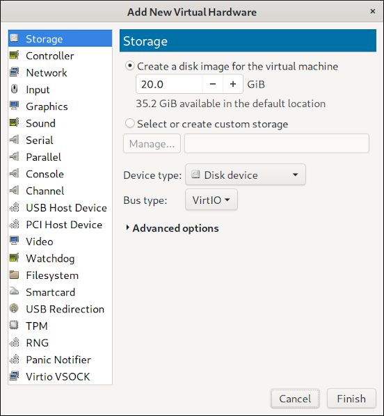 因为我选择了自定义配置,virt-manager 打开了一个有一组设备和设置的页面。这里是重点!