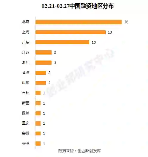 本周北上广融资事件共39起,占比69.64%;江苏、浙江各3起;台湾有2起。