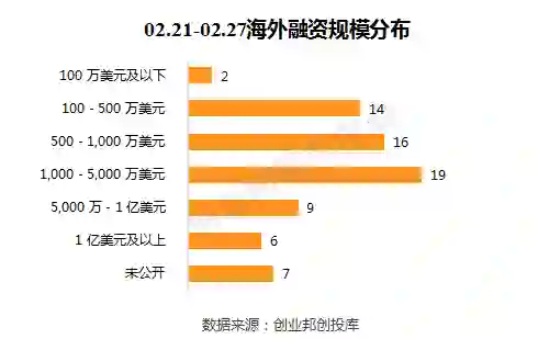 本周海外融资事件的融资规模主要集中在1,000-5,000万美元,共19起。