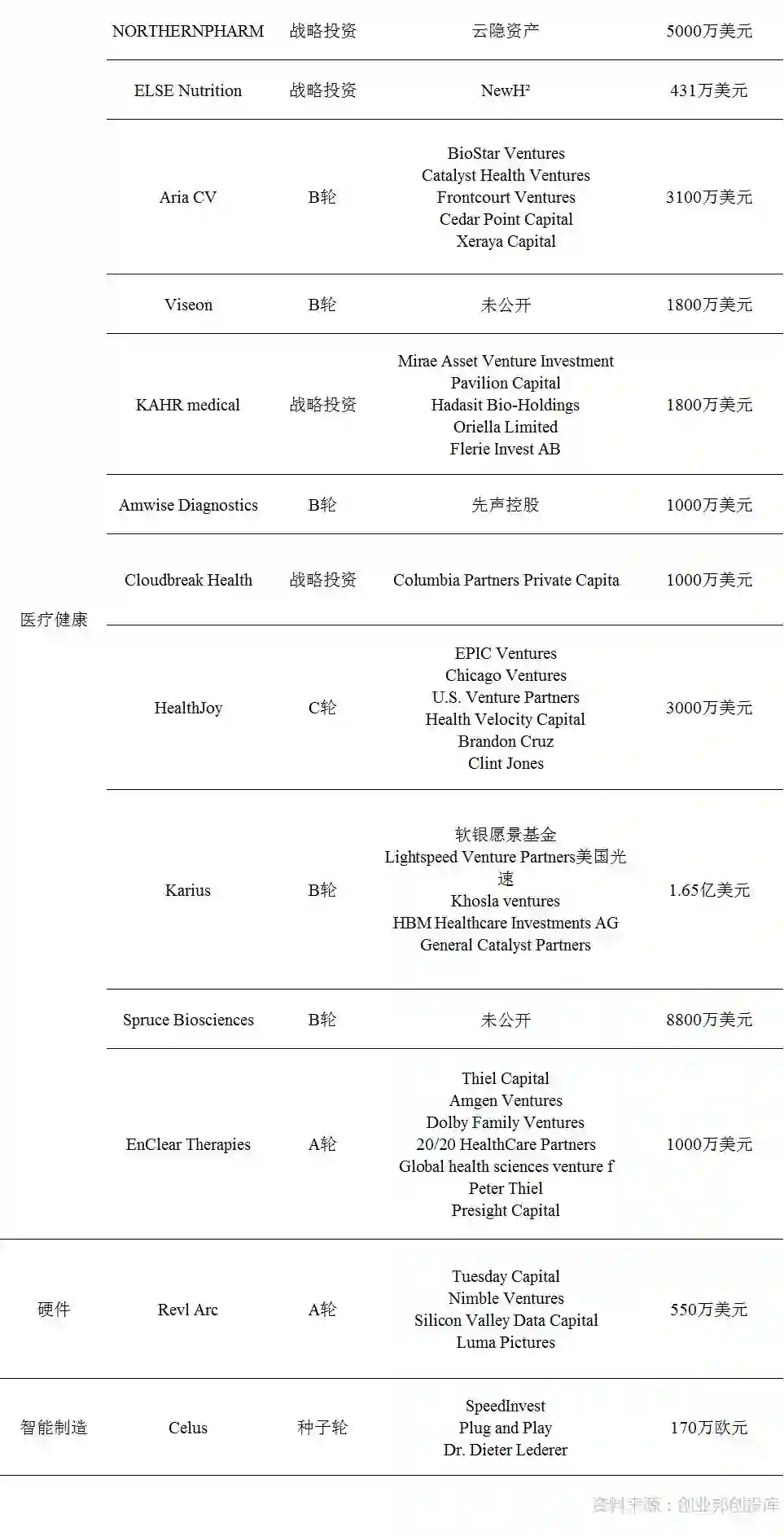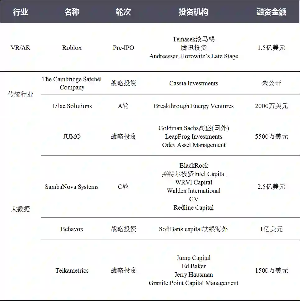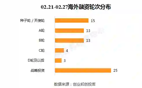本周海外融资事件的融资轮次主要集中在前期(种子轮、天使轮、A轮),共28起;中后期(B轮、C轮、D轮及以后)有20起;战略投资有25起。