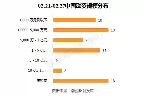 本周融资事件的融资规模在1,000-5000万元的数量最多,有13起。