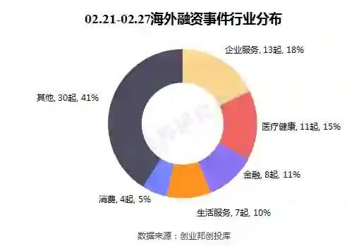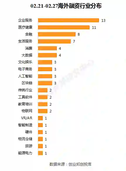 本周披露海外融资事件涉及20个行业领域,其中融资案例数量最多的五大行业分别是:企业服务13起,医疗健康11起,金融8起,生活服务7起,消费、大数据并列4起。