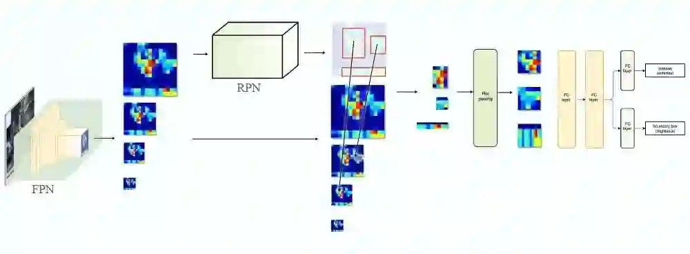 FPN生成了特征映射金字塔后,应用RPN(见上一节)生成ROI。根据ROI的尺寸,选择最合适的尺度上的特征映射以提取特征片。