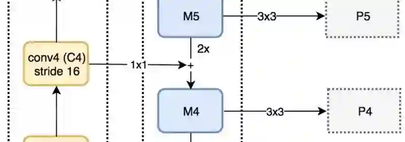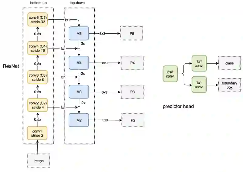 上图中,FPN使用一个1x1的卷积过滤器将C5(最上面的卷积模块)的频道深度降至256维,得到M5。接着应用一个3x3的卷积得到P5,P5正是用于目标预测的第一个特征映射。
