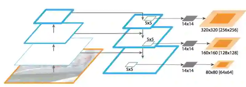 类似Mask R-CNN,FPN也是一个优良的图像分割提取掩码。下图中,应用5x5的滑窗于特征映射,以生成14x14分割。之后,合并不同尺度的掩码以形成最终的掩码预测。