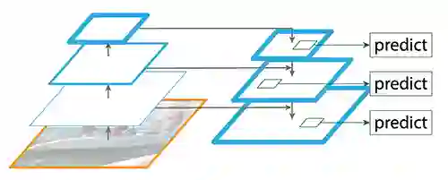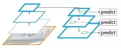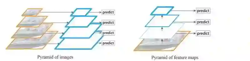 检测不同尺度的目标(尤其是其中的小目标)很有挑战性。我们可以使用同一图像的不同尺度版本来检测目标(下图左部)。然而,处理多尺度图像很费时,内存需求过高,难以同时进行端到端训练。因此,我们可能只在推理阶段使用这种方法,以尽可能提高精确度,特别是在竞赛之类不顾及速度的场景中。我们也可以创建特征金字塔来检测目标(下图右部)。然而接近图像的、由低层结构组成的特征映射在精确目标预测上效果不佳。