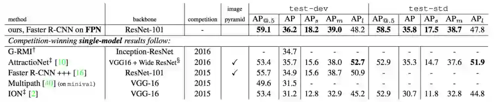 FPN和当前最先进的检测器实力相当。事实上,FPN击败了COCO 2016和2015挑战的赢家。