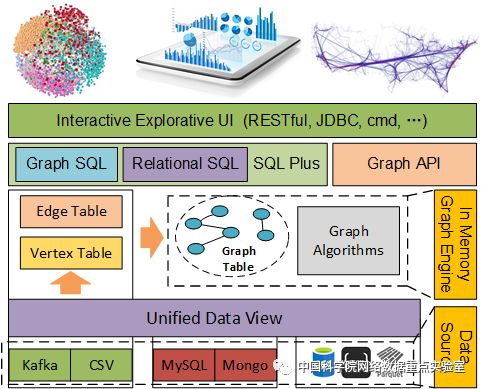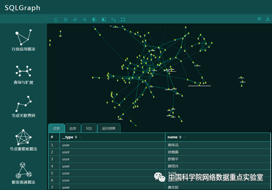 值得一提的是,该论文不但是一项学术研究成果,而且已经应用到了实际应用系统中。网络数据实验室应用该成果自主研发了面向分析的高性能图数据库系统软件SQLGraph,它具有两方面的特点:一是将传统的关系型数据分析与图计算分析融为一体,可以在一条扩展语法的SQL语句中完成关系型数据分析和图分析的无缝结合;二是支持任意类型节点、边的图构建,且节点和边都可以带任意属性。SQLGraph将传统关系型数据库的SQL分析和图分析紧密的结合在一起,可使用类SQL进行交互式分析。支持多元数据的导入,支持属性图、无向图、异构图,并支持图的可视化交互式分析。不仅可以为知识图谱等分析应用提供底层计算基础,也可以为传统关系数据库中的隐含关联关系挖掘提供强大支撑。