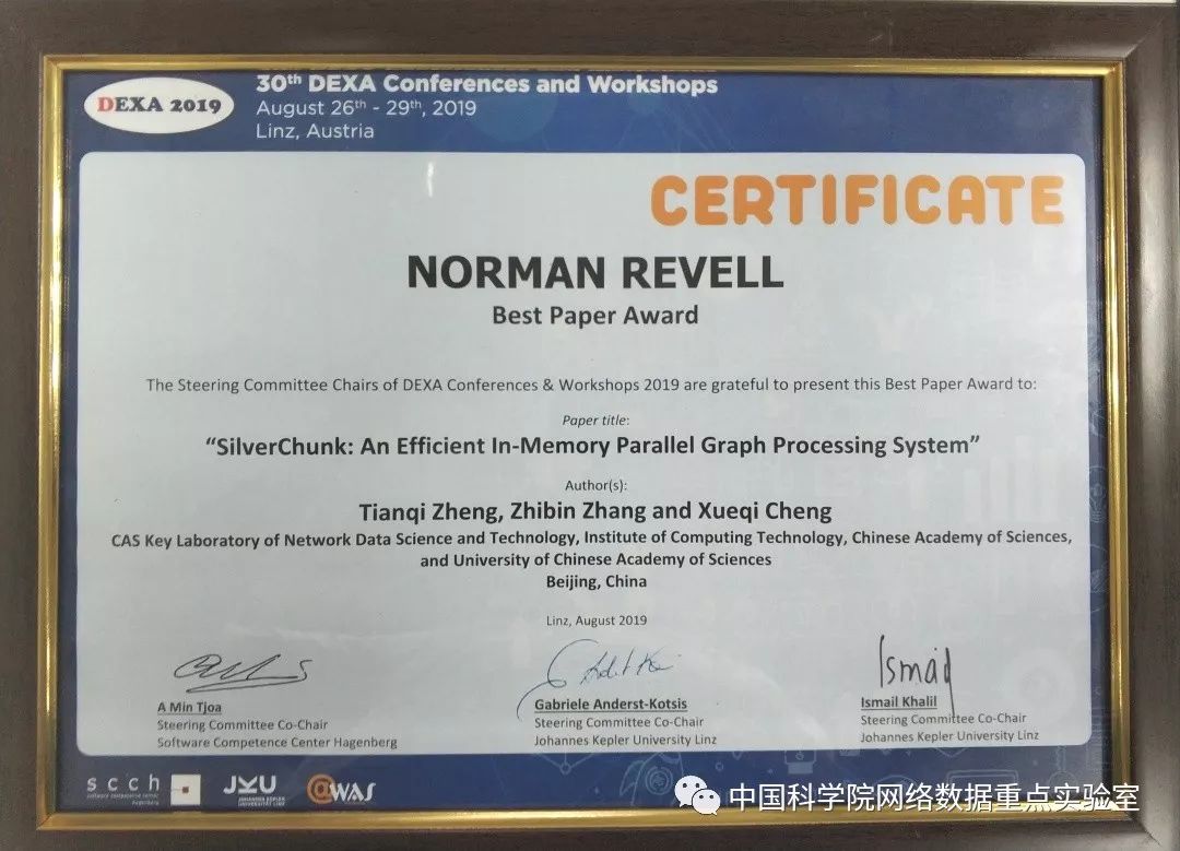 DEXA国际会议自1990年创办起,至今已举办30届,已成为数据库、信息及知识发现领域内有重要影响力的国际学术会议。会议保持高的学术水准,是我国计算机学会认定的高水平国际学术会议。2019年度会议共收到投稿300余篇,录取论文66篇,论文录用率在20%左右。郑天祺博士的论文被评为本届会议的唯一一篇最佳论文。