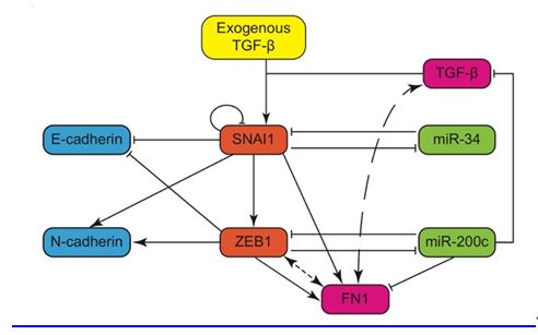 动态诱导的竞争性内源RNA调控上皮间质转化示意图
