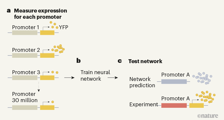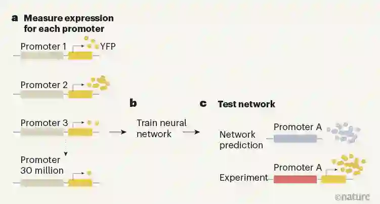具体来说,研究人员使用了3000多万个不同的启动子,每个启动子的长度是80个碱基对,并对每个含有这些启动子之一的细胞产生的YFP进行量化。