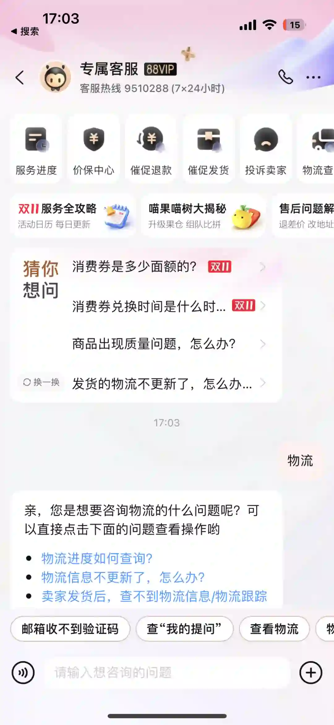 下面我举个某宝的例子看下:当我发送【物流】关键词时,系统自动回复【物流进度】【物流不更新】等问题: