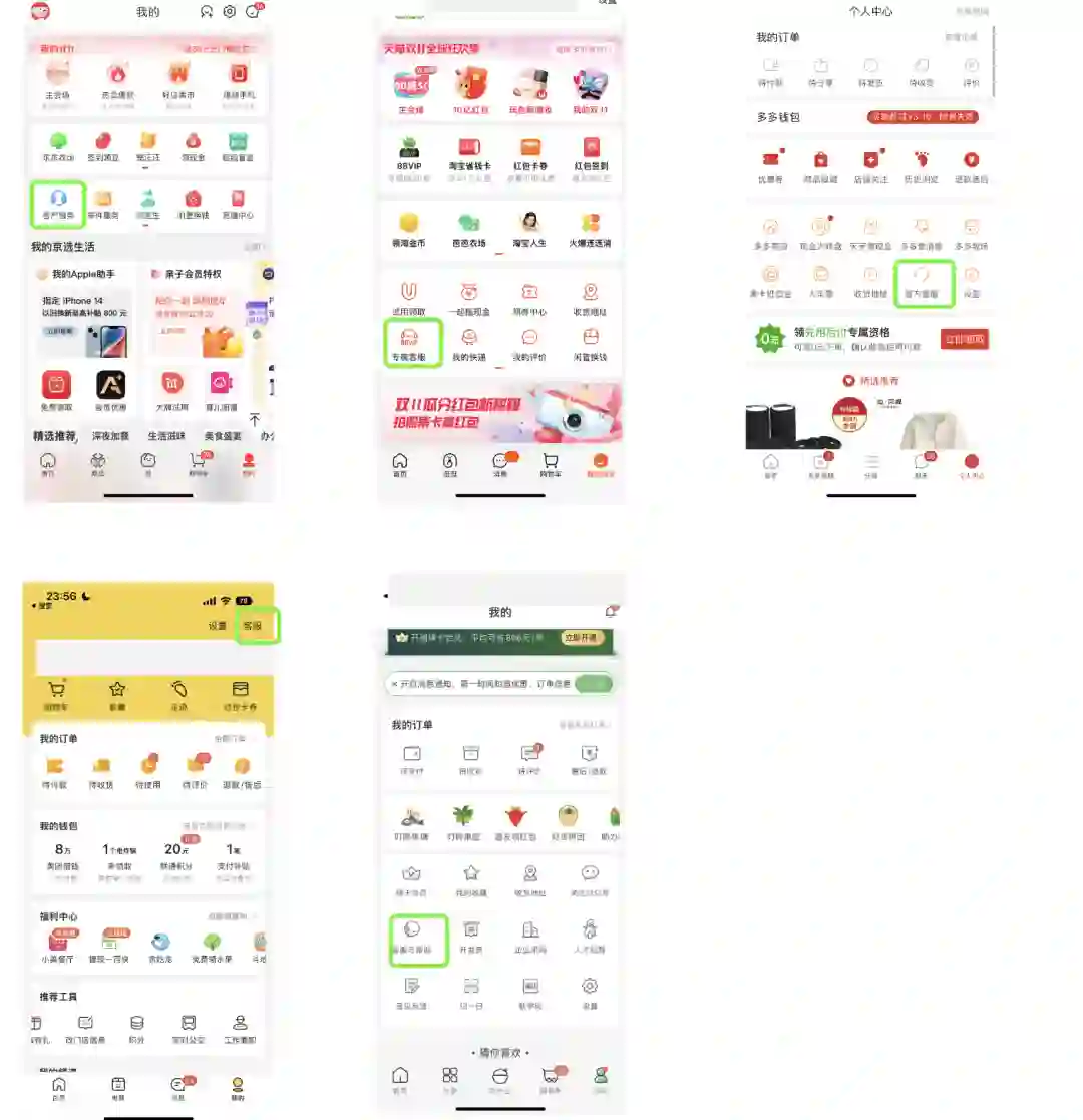 客服代表平台,代表商家的形象,我截取了我使用较多的几个APP,可以看出,客服的入口大多数是在【我的】tab下,有独立入口,相对明显。因为线上的客服入口,是用户和平台之间的通道。