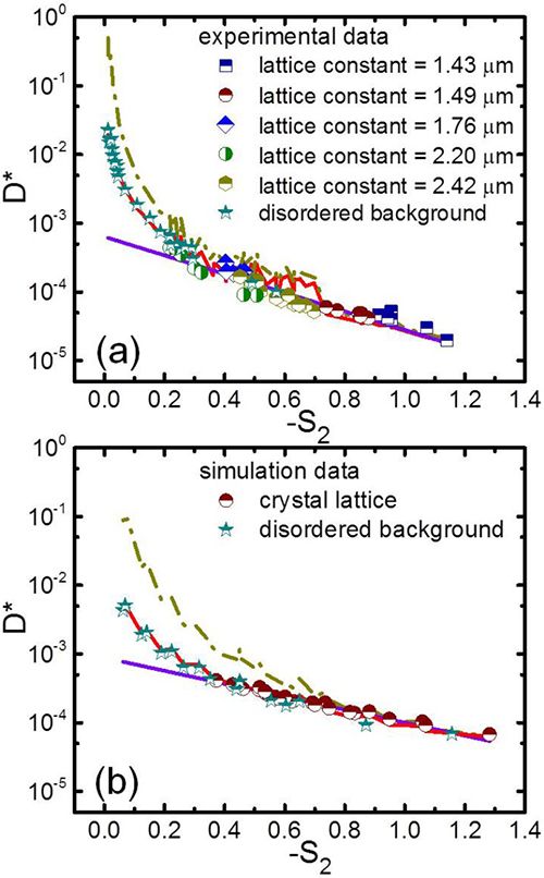 理论研究很早就提出了一个粒子扩散系数与介质结构熵S2之间的指数标度关系,并在众多的计算机模拟研究中得到了证实。同时,这一模型也存在一些争议,例如在低浓度条件下,一些计算机模拟的结果发现扩散系数与结构熵S2明显偏离这一简单的指数关系。在实验上,关于扩散动力学与介质结构之间的研究非常少,特别是对已有标度关系的普适性目前在实验上还无法得到判定。这主要是由于在原子系统中,同时观测扩散粒子的运动和介质的结构熵比较困难。在这一方面,胶体体系有独特的优势,利用光学显微方法,能够实现胶体粒子和扩散介质的同时测量,是检验和探索新的复杂介质中扩散规律的理想平台。