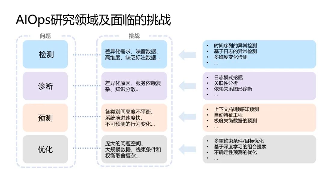 AIOps 的研究主要聚焦于检测、诊断、预测和优化四个领域,每个领域涵盖的运维任务不同,又各自面临不同的挑战