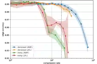电子显微镜成像过程中的随机变化会导致图像噪声。这些噪声在理论上很难压缩,因为它缺乏空间相关性或其他可以用于较少字节描述的结构。于是我们分别在“快”采集模式(导致大量噪声)和“慢”采集模式(导致少量噪声)下获取同一块组织的图像,然后训练神经网络从“快”扫描推断“慢”扫描。标准图像压缩编解码器能够(有损地)压缩“虚拟的”慢扫描图像,与原始数据相比,这些图像的伪影更少。我们相信这一进展可能会极大地缓解与未来大规模连接组学项目相关的成本压力。