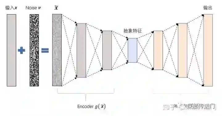 下图是Denoising AutoEncoder的模型框架。目前添加噪声的方式大多分为两种:添加服从特定分布的随机噪声;随机将输入x中特定比例置为0。有没有觉得第二种方法跟现在广泛石红的Dropout很相似,但是Dropout方法是Hinton等人在2012年才提出来的,而第二种加噪声的方法在08年就已经被应用了。这其中的关系,就留给你思考一下。
